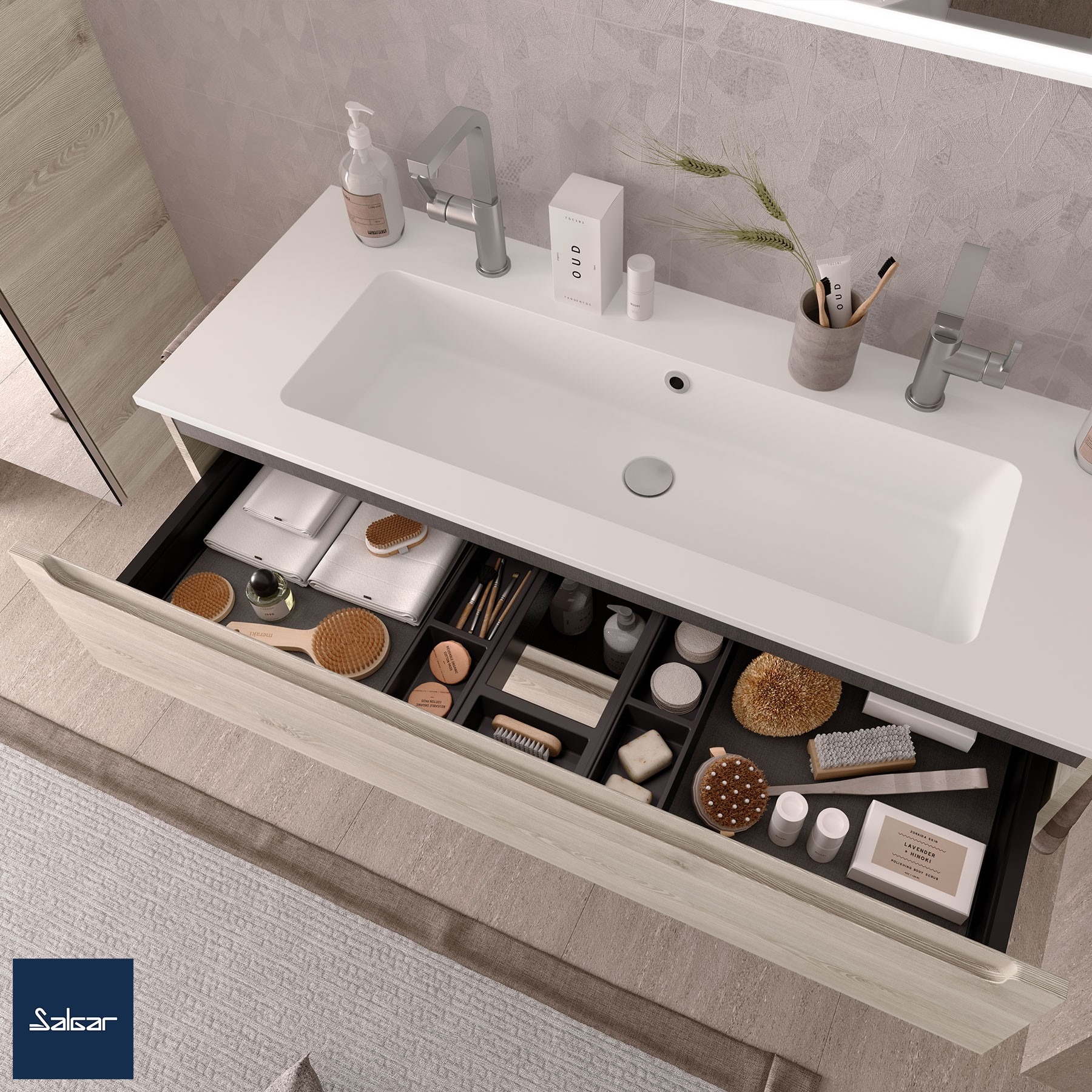 Salgar’s worktop ranges elevate these basins further. The Domus worktop stands out—made from MDF with a 3D coating. It mimics wood texture beautifully. Pick from Africa Oak, Walnut Maya, or Natural finishes. This 100mm-high skirt resists moisture with no visible edge joints. It pairs with sit-on bowls or integrated basins—luxury that lasts.
