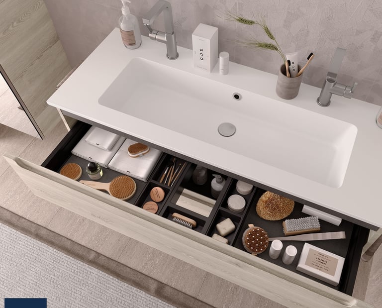 Picture a Constanza basin on a Walnut Maya Domus worktop. Its white shine pops against the warm wood. Or see a Vilna with a Black Velvet sit-on bowl nearby. The sleek pairing catches the eye. Two drawers or a bold basin keep clutter tidy. It’s luxury you use—modern, lasting, practical. UK stock or Spanish extras, your choice.