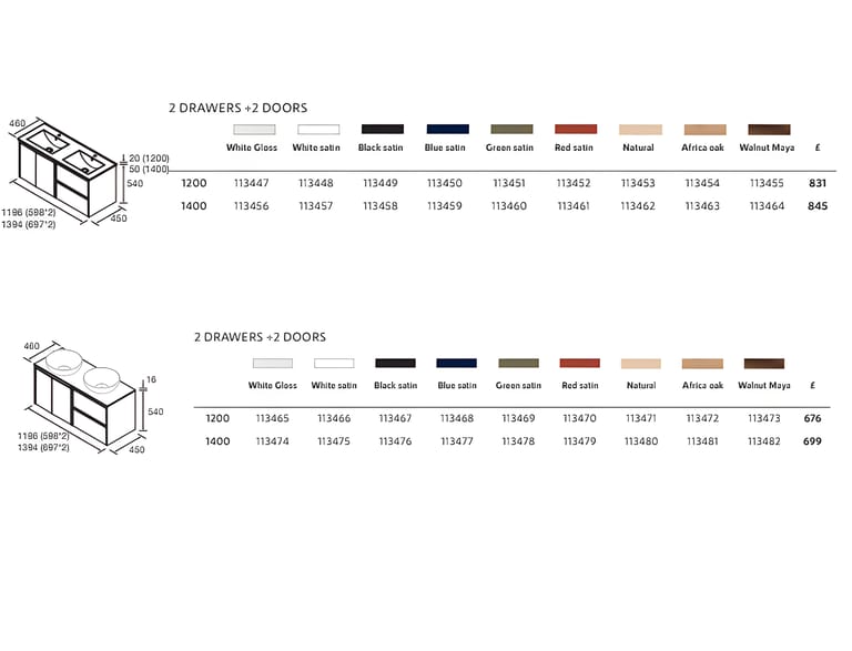 Choose from integrated double basin ,with 1 tap hole on each or why not choose a beautiful worktop to situate your sit on bowls, all worktops come in the same finish as the unit, meaning you complete the look perfectly.