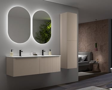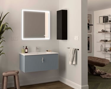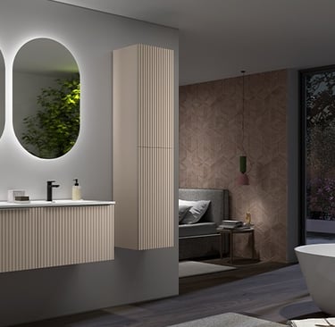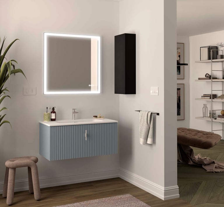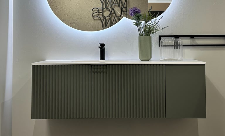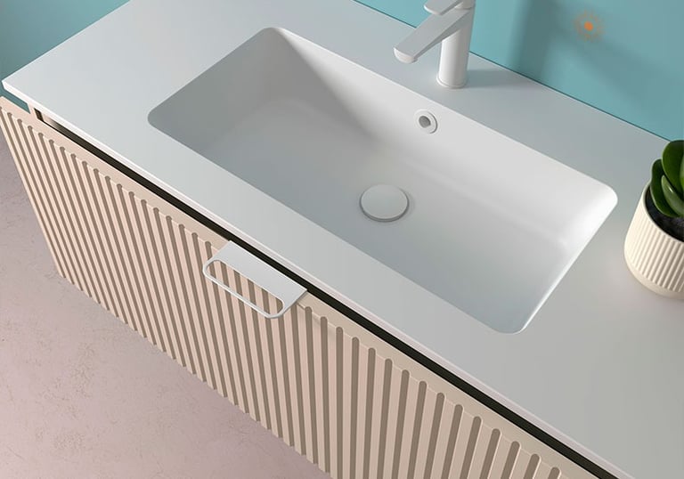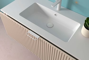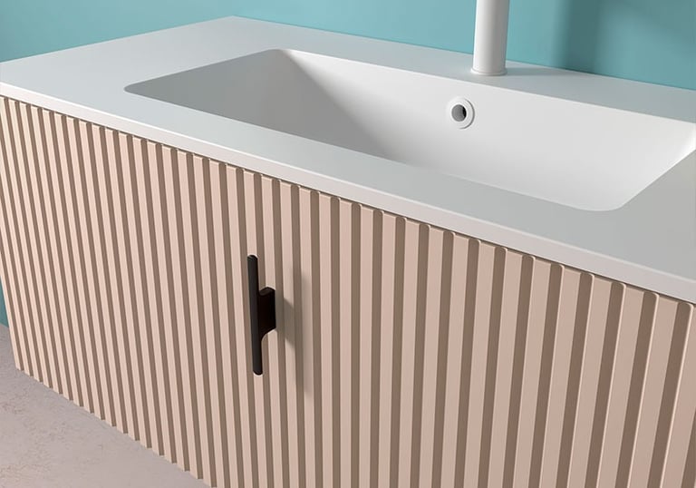 Picture a Night Blue Biba with a Bai handle and its grooved front in your bathroom. Or two 600mm White Cotton units with Fibi handles and a double basin for you and someone else. It’s storage with style—modern, lasting, and practical. UK stock or Spanish extras, your choice.