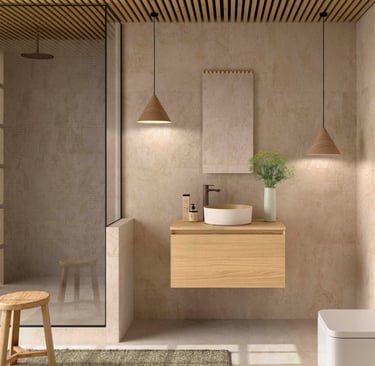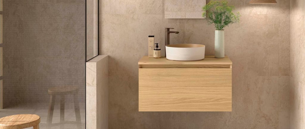 Larger bathrooms suit wood perfectly. Walnut Maya fills Biba’s wider units. Africa Oak covers Compakt’s broad tops. Natural stretches across Monterrey’s 1200mm. Mara’s options match bigger spaces.